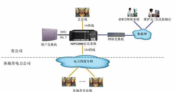 該會(huì)議系統(tǒng)是安徽省公司與地市電力公司“一主兩備”系統(tǒng)的電話會(huì)議系統(tǒng)備份系統(tǒng),通過(guò)2個(gè)數(shù)字中繼與省通信公司用戶交換機(jī)互連,采用NO.7信令。16路4線中1路接主會(huì)場(chǎng)調(diào)音臺(tái),實(shí)現(xiàn)會(huì)議室擴(kuò)音設(shè)備的接入,其余15路接各地市電力公司原四線專網(wǎng)資源連接,通過(guò)以太網(wǎng)口與D-LINK網(wǎng)絡(luò)交換機(jī)互連,接入安徽省電力的數(shù)據(jù)網(wǎng),實(shí)現(xiàn)實(shí)時(shí)維護(hù)管理及會(huì)議控制等功能。