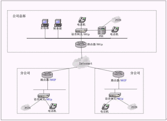 首先將VOIP電話網(wǎng)關(guān)的網(wǎng)絡(luò)接口接入到公司和分部(分公司)的局域網(wǎng)中,通過ADSL、ISDN、撥號上網(wǎng)等方式,同連接在此因特網(wǎng)上的其它VOIP電話網(wǎng)關(guān)相連,從而將不同地域的電話連接在一起,組成整個(gè)公司的IP電話網(wǎng),如果總部或分部有用戶程控交換機(jī),還可以將VOIP電話網(wǎng)關(guān)接入程控交換機(jī),使得整個(gè)交換機(jī)的分機(jī)都能利用IP網(wǎng)絡(luò)撥打免費(fèi)電話。如果這個(gè)VOIP設(shè)備具有PBX的功能。那么電話網(wǎng)關(guān)的多種接口還可以與電信(PSTN)相連,從而將專網(wǎng)的IP電話語音網(wǎng)與整個(gè)公網(wǎng)銜接成一個(gè)大的電話網(wǎng)絡(luò)。