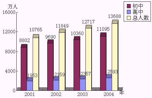 據(jù)國家最新統(tǒng)計資料分析,2001年中學(xué)學(xué)生人數(shù)已達10765萬人,而且學(xué)生人數(shù)還在快速增長。初中學(xué)生人數(shù)以每年6.5%的速度增長,普通高中學(xué)生人數(shù)也以每年10%-11%的速度增長。