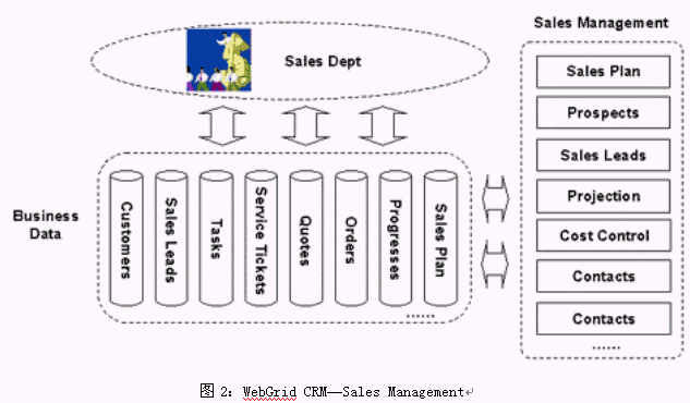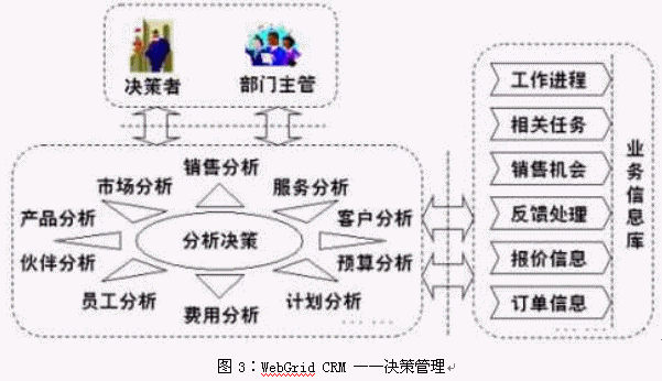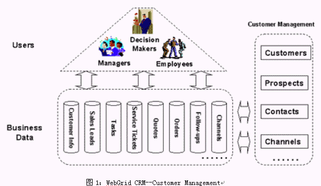 WebGrid CRM是基于CRM理念而設(shè)計的,它將面向客戶的所有業(yè)務(wù)進行整合,提供了統(tǒng)一的業(yè)務(wù)平臺,并使用工作流技術(shù)將各種業(yè)務(wù)緊密聯(lián)系起來。WebGrid CRM 的功能可以歸納為三個方面:1) 對銷售、營銷和客戶服務(wù)三部分業(yè)務(wù)流程的信息化;2) 與客戶進行溝通所需要的手段(如電話、傳真、網(wǎng)絡(luò)、Email等)的集成和自動化處理;3) 對上面兩部分功能所積累下的信息進行的加工處理,產(chǎn)生客戶智能,為企業(yè)的戰(zhàn)略戰(zhàn)術(shù)的決策作支持。見下圖所示:
