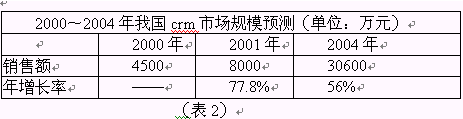 國內(nèi)CRM市場經(jīng)過一段時間的快速增長,2000年銷售額達到4500萬元左右。2001年市場情況將更好,預(yù)計銷售額將是上年的兩倍左右。CCID根據(jù)大量調(diào)查分析,對我國CRM市場規(guī)模作出如下預(yù)測: