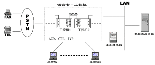 在一些小型CALL CENTER系統(tǒng)中,人們通常通過語音板卡加工控機的方式搭建系統(tǒng),通常一臺設(shè)備就集成了ACD、IVR、CTI等各種資源,各資源的使用、調(diào)派通過軟件進行控制,有效的解決了建設(shè)成本高、系統(tǒng)構(gòu)造繁復的問題,具有相當?shù)撵`活性。然而由于工控機和語音板卡容量有限,同時其標準最多只能是工業(yè)級標準,因此在構(gòu)建相對大型的呼叫中心時就總是捉襟見肘。為了增加系統(tǒng)容量,解決多臺PC之間進行通道交換的難題,人們又設(shè)計了過機卡和過機線來解決,其應用系統(tǒng)如下圖:
