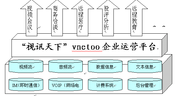 VNETOO視訊運(yùn)營(yíng)平臺(tái)具有強(qiáng)大的數(shù)據(jù)功能和優(yōu)質(zhì)的音視頻效果,是集"視頻+語音+數(shù)據(jù)+IM(即時(shí)通信)+VOIP(網(wǎng)絡(luò)電話)+計(jì)費(fèi)+后臺(tái)管理"的基于IP網(wǎng)絡(luò)世界一流視訊服務(wù)提供平臺(tái),它革命性地開創(chuàng)了視訊運(yùn)營(yíng)領(lǐng)域的全新模式。(見圖表一:"視訊天下"vnetoo運(yùn)營(yíng)平臺(tái)結(jié)構(gòu))。