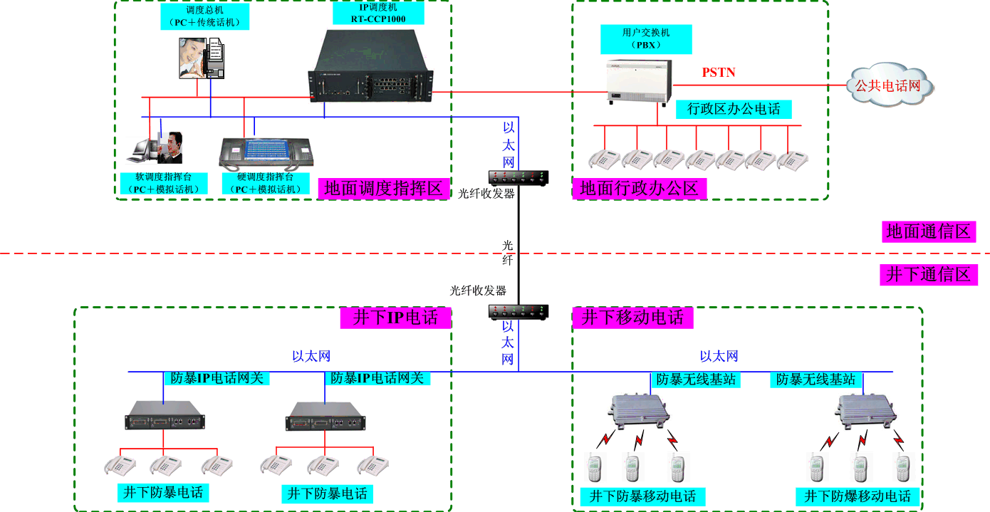 確保煤礦企業(yè)安全生產(chǎn)無疑是煤礦企業(yè)的頭等大事,政府對于煤礦的安全生產(chǎn)也提出了更高要求。融天科技聯(lián)手中國煤炭科學(xué)研究院,通過實地應(yīng)用考察,結(jié)合礦區(qū)生產(chǎn)環(huán)境及礦區(qū)的通信狀況,推出了煤礦企業(yè)安全生產(chǎn)“三網(wǎng)合一”的一體化通信解決方案。該方案完美地融合固話網(wǎng)、IP網(wǎng)、無線網(wǎng),將調(diào)度指揮功能從地面擴展到遠(yuǎn)端井下的每一個角落,可靈活的對地面固話分機、遠(yuǎn)程IP分機以及井下無線分機進(jìn)行統(tǒng)一編號,統(tǒng)一指揮、統(tǒng)一調(diào)度,可支持軟鍵盤、硬鍵盤、觸摸屏鍵盤方式,同時還能提供調(diào)度指揮+行政辦公一體化的通信系統(tǒng),也能提供接口與原有的行政辦公電話系統(tǒng)無縫整合。目前,該系統(tǒng)已經(jīng)完美地應(yīng)用在山東柴里煤礦、河北開灤煤礦、山西陽坡泉煤礦、神華集團(tuán)寧煤煤礦等煤礦企業(yè)中。系統(tǒng)組網(wǎng)大致如下: