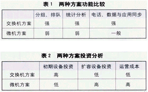 一般來說,最能影響呼叫中心運行能力的功能特征有3個方面:分組排隊功能、統(tǒng)計分析功能以及電話、數(shù)據(jù)與應用的同步功能。上述兩種方案比較列于表1和表2。
