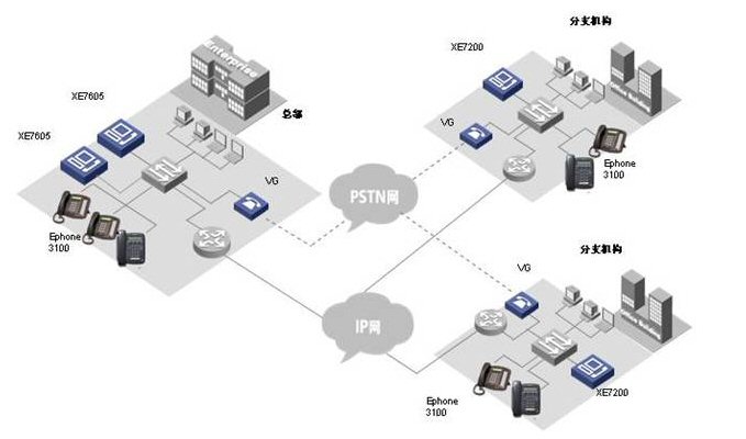 各小分支機構(gòu)的IP語音終端可以直接注冊到本地XE 7000上, 從而實現(xiàn)整網(wǎng)的分布式部署。
