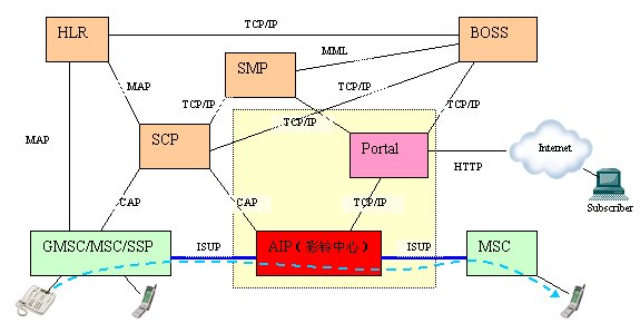 例如華為移動(dòng)智能網(wǎng)彩鈴方案的主要流程包括呼叫流程和管理流程,屬于主叫端局觸發(fā)方式。在主叫端局的被叫流程中通過(guò)SCP下發(fā)帶有路由前綴的Connect信令把呼叫轉(zhuǎn)移到AIP(彩鈴中心),AIP橋接呼叫到被叫端局,個(gè)性化鈴音在被叫端局發(fā)送ACM之后屏蔽普通鈴音,向主叫端局播放被叫定制的彩鈴音。管理流程需要AIP、SCP和MSC的配合,主叫用戶(hù)撥打彩鈴管理流程接入碼觸發(fā)到SCP,SCP判斷帳戶(hù)權(quán)限通過(guò)后,下發(fā)ETC信令,讓MSC和AIP建立臨時(shí)連接,由AIP進(jìn)行管理流程的操作。系統(tǒng)結(jié)構(gòu)圖如圖2所示,這種方式屬于"有迂回"方式。
