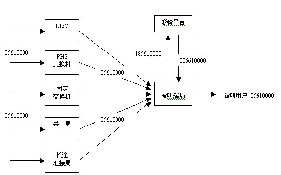 - 彩鈴平臺(tái)在收到"彩鈴平臺(tái)號(hào)碼前綴+原被叫號(hào)碼"的呼叫后,分析出業(yè)務(wù)用戶(hù)(被叫號(hào)碼),在彩鈴平臺(tái)上進(jìn)行相關(guān)的業(yè)務(wù)處理,然后在被叫號(hào)碼前加一個(gè)另外的號(hào)碼前綴(稱(chēng)作"接通被叫指示前綴"),被叫號(hào)碼成了"前綴2+原被叫號(hào)碼"(避免被叫端局的二次觸發(fā)),彩鈴平臺(tái)把這個(gè)新被叫號(hào)碼接續(xù)回到被叫交換機(jī);