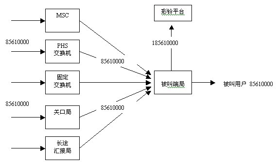 - 當(dāng)主叫呼叫彩鈴業(yè)務(wù)用戶(hù)歸屬的交換機(jī)時(shí)時(shí),被叫交換機(jī)判斷這個(gè)用戶(hù)有"彩鈴屬性"標(biāo)志,一面接續(xù)業(yè)務(wù)用戶(hù)(被叫),同時(shí)一面在被叫號(hào)碼前面加上一個(gè)彩鈴平臺(tái)的號(hào)碼前綴,這樣被叫號(hào)碼成了"前綴1+原被叫號(hào)碼",然后被叫交換機(jī)把這個(gè)新被叫號(hào)碼接續(xù)到彩鈴平臺(tái);