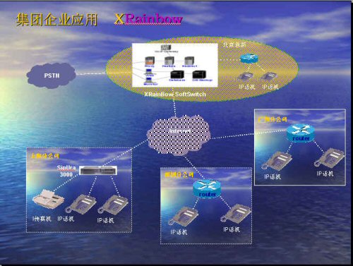 。。首先我們需要這4個地點(diǎn)都有自己的網(wǎng)絡(luò)接入,最好是寬帶。以北京總部為列,如果將Xrainbow系統(tǒng)放在北京總部,這就需要北京總部這邊有一個固定IP地址的網(wǎng)絡(luò)接入,其他分公司不需要固定ip地址,只要可以上網(wǎng)就可以登錄到北京總部的Xrainbow系統(tǒng)。這樣企業(yè)與分支機(jī)構(gòu)之間就實(shí)現(xiàn)了零話費(fèi),同時(shí)還可以提供傳真業(yè)務(wù)。另外終端設(shè)備可以隨意移動,只要可以上網(wǎng)的地方就可以接入我們的終端設(shè)備,免去了因公司的發(fā)展或者搬動而要去申請初裝大量電話的煩惱。