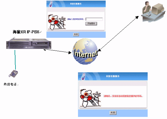 如圖:用戶在上網(wǎng)訪問企業(yè)網(wǎng)站的時候,如果需要和企業(yè)進行聯(lián)系,手邊沒有麥克風,就可以使用企業(yè)在網(wǎng)頁上的CALL-BACK800鏈接,點擊后就彈出一個窗口,然后輸入身邊的座機或者手機號碼,點擊開始服務(wù),窗口出現(xiàn)紅色的"請稍候,系統(tǒng)將自動回撥到您提供的號碼" ,稍等一會后,用戶的電話就會被呼叫,接通后就可以和企業(yè)的熱線電話進行溝通。可以實現(xiàn)和WEB800同樣的效果,但是CALL-BACK800相對用戶來說是一個更方便的溝通方式。