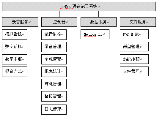 NetLog語(yǔ)音記錄系統(tǒng)采用基于分布式、多層控制管理體系的設(shè)計(jì)思想,將電話線路與內(nèi)部網(wǎng)絡(luò)有效地結(jié)合在一起,形成一套完整的語(yǔ)音錄制、管理系統(tǒng)。采用目前先進(jìn)的C/S模型,能更方便、快捷地實(shí)現(xiàn)控制臺(tái)對(duì)網(wǎng)絡(luò)內(nèi)所有記錄服務(wù)的狀態(tài)監(jiān)視,記錄查詢(xún),操作控制等,采用統(tǒng)一的管理化機(jī)制,使文件的管理和備份更簡(jiǎn)潔。