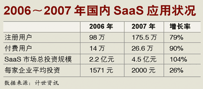 計(jì)世資訊《2007-2008年軟件運(yùn)營(yíng)服務(wù)市場(chǎng)研究報(bào)告》數(shù)據(jù)顯示,2007年管理型SaaS應(yīng)用市場(chǎng)規(guī)模為4.5億元人民幣,付費(fèi)企業(yè)用戶數(shù)為26萬(wàn),企業(yè)年平均消費(fèi)水平僅為2000元/年,其中近八成用戶年平均消費(fèi)低于2000元。目前國(guó)內(nèi)SaaS的用戶群仍以中小企業(yè)用戶為主,不過(guò)SaaS提供商Saleforce的加入有望改變這一現(xiàn)狀。