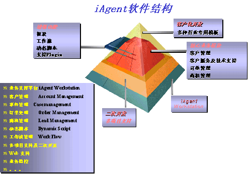 iAgent3.0從軟件內(nèi)部的結(jié)構(gòu)體系上加以突破,統(tǒng)一開放的應(yīng)用平臺上組合功能強(qiáng)大的二次開發(fā)工具,并在此基礎(chǔ)上加以針對行業(yè)而特別設(shè)計(jì)的功能模板。更好的適應(yīng)了企業(yè)處理流程的多樣化和需求的復(fù)雜化,并為企業(yè)高速的業(yè)務(wù)增長和功能需求增長帶來極大的拓展空間。軟件結(jié)構(gòu)如下圖所示:
