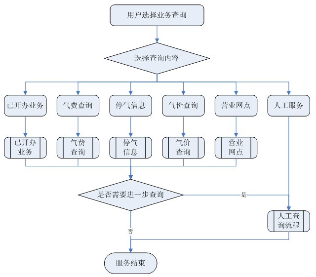 業(yè)務咨詢:用戶通過人工、自動語音等方式咨詢有關(guān)政策法規(guī)、資費標準、用氣常識、報裝方法等,系統(tǒng)以語音、傳真、Email、短消息等方式回復客戶。