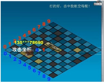 這里是游戲的主戰(zhàn)場,觀眾每發(fā)送一個轟炸坐標(biāo)過來,都會在這里有體現(xiàn)。如轟炸者的手機(jī)號、攻擊坐標(biāo)、是否擊中(擊中是一團(tuán)火光,未擊中則是水花)、及語音及文字提示。