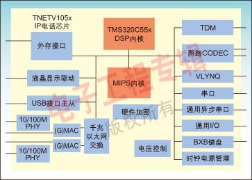 TNETV1050芯片包含一個內(nèi)置的以太網(wǎng)交換機以及雙PHY,可以在桌面上提供IP電話服務(wù)的同時,提供一個PC連接。TNETV1050的USB接口可以使IP電話連接多種USB設(shè)備,如PDA等。設(shè)計者還可以通過TI的VLYNQ接口擴展多種其他功能,例如Wi-Fi模塊,硬件加密等。芯片集成了LCD控制器、CODEC以及鍵盤接口,降低了系統(tǒng)成本。