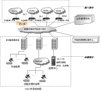 VAN(Voice Area Network)是一個(gè)支持多接入點(diǎn)、多承攬點(diǎn)、多業(yè)務(wù)點(diǎn)、多數(shù)據(jù)點(diǎn)的大型分布式呼叫中心構(gòu)造平臺(tái)。它針對(duì)大型分布式呼叫中心、企業(yè)營銷網(wǎng)絡(luò)及行業(yè)公共交換平臺(tái)的業(yè)務(wù)需求和技術(shù)需求開發(fā),支持多種接入方式并具備多種服務(wù)處理手段,同時(shí)可利用其軟件平臺(tái)——DCCMS呼叫管理系統(tǒng)對(duì)多種業(yè)務(wù)進(jìn)行分散式管理,對(duì)各類資源進(jìn)行統(tǒng)一控制,實(shí)現(xiàn)全網(wǎng)數(shù)據(jù)協(xié)同管理。