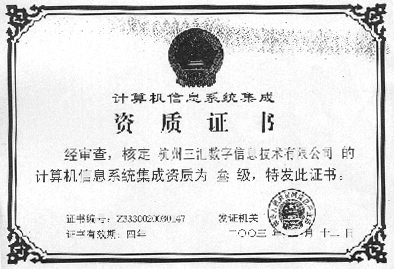 按照《計算機信息系統(tǒng)集成資質(zhì)管理辦法(試行)》和《計算機信息系統(tǒng)集成資質(zhì)等級評定條件(試行)》,經(jīng)信息產(chǎn)業(yè)部計算機信息系統(tǒng)集成資質(zhì)認證管理委員會審定,在不久前,信息產(chǎn)業(yè)部公布的計算機信息系統(tǒng)集成資質(zhì)證書企業(yè)名單中,杭州三匯數(shù)字信息技術(shù)有限公司獲得叁級認證。