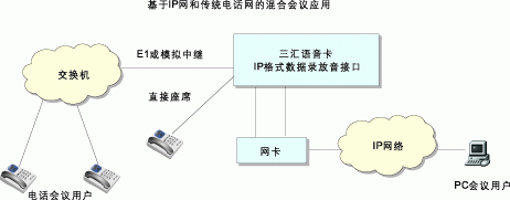 交互式電話會(huì)議與傳統(tǒng)的電話會(huì)議的區(qū)別就在于開會(huì)時(shí)不需要由會(huì)議主持人控制由某人發(fā)言,而是所有與會(huì)者可以自由發(fā)言,就如同坐在同一間會(huì)議室中一樣。三匯公司所有型號(hào)的基于DSP技術(shù)的語音卡,包括數(shù)字卡和模擬卡,均內(nèi)置了對(duì)交互式電話會(huì)議的支持,只要使用語音卡,無需額外的會(huì)議卡,就可以構(gòu)成具有完善功能的交互式電話會(huì)議系統(tǒng)。三匯公司還采用了獨(dú)創(chuàng)的分布式電話會(huì)議實(shí)現(xiàn)技術(shù),電話會(huì)議的關(guān)鍵資源----混音器分布在每一個(gè)通道中。因此語音卡對(duì)會(huì)議系統(tǒng)的支持具有極大的靈活性,既可以召開大量的三方會(huì)議,也可召開所有通道同時(shí)參加的大型會(huì)議,無論是會(huì)議的數(shù)量還是參加會(huì)議的人數(shù)均只受系統(tǒng)總通道數(shù)的限制。三匯語音卡還支持IP會(huì)議和傳統(tǒng)電話會(huì)議的混合應(yīng)用。