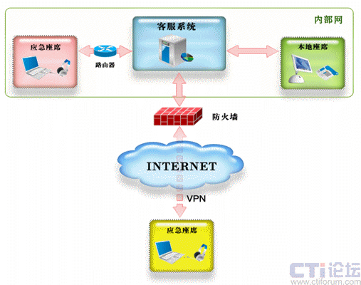 配置應(yīng)急座席的必要條件之一是網(wǎng)絡(luò)環(huán)境,要求應(yīng)急座席家庭計(jì)算機(jī)能夠連接到Internet或能夠直接訪問客服系統(tǒng)內(nèi)部網(wǎng)絡(luò),位于客服網(wǎng)絡(luò)防火墻之外需要通過相應(yīng)的技術(shù)連接到系統(tǒng),實(shí)現(xiàn)對(duì)系統(tǒng)的訪問。