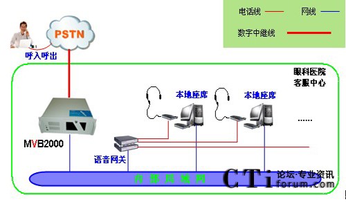醫(yī)院采用暢信達通信MVB2000系統(tǒng)作為交換平臺,采用1路E1數(shù)字中繼線接入,對外公布統(tǒng)一的外線呼入號碼,采用語音網關結合話機作為座席終端,前期投入8位人工座席,系統(tǒng)架構形式如下: