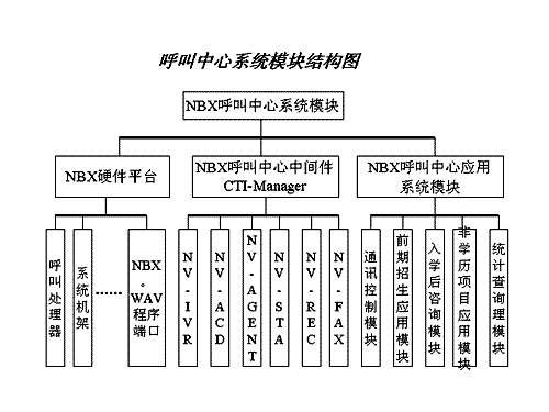 。。此呼叫中心系統(tǒng)主要由三大部分組成:美國(guó)3COM公司的NBX產(chǎn)品為系統(tǒng)平臺(tái),及其配套的中間件產(chǎn)品CTI-Manager和上層第三方訂制的教育行業(yè)應(yīng)用軟件。根據(jù)需求,應(yīng)用軟件由五個(gè)功能模塊組成:通訊控制模塊、前期招生應(yīng)用模塊、入學(xué)后咨詢應(yīng)用模塊、非學(xué)歷項(xiàng)目應(yīng)用模塊、統(tǒng)計(jì)查詢模塊。系統(tǒng)模塊結(jié)構(gòu)圖如下:
