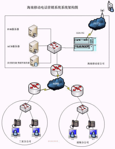 此次為電話營銷系統(tǒng)一期工程,在省公司部署一套NBX V5000系統(tǒng)及相應(yīng)的CTI服務(wù)器,通過2條E1接入PSTN,在18個地市直接部署50個IP電話終端及坐席端軟件,語音走移動已有的MDCN網(wǎng)絡(luò),一個集中受理分布處理的呼叫中心系統(tǒng)就建設(shè)起來啦,本次工程從設(shè)備到貨、系統(tǒng)上線試運(yùn)行,僅僅用了1個星期,我們海南移動公司的項目經(jīng)理都驚訝的說"太快啦啦,要是使用傳統(tǒng)的排隊機(jī)部署一個分布全省的類似系統(tǒng),少說工期也得幾個月"。經(jīng)過1個月的試運(yùn)行,系統(tǒng)運(yùn)行穩(wěn)定,各項系統(tǒng)指標(biāo)滿足合同要求,在11月份系統(tǒng)順利通過初驗。