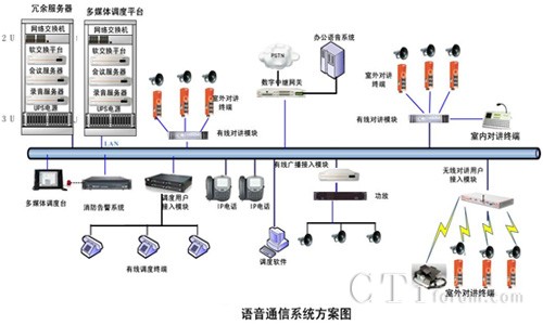 整體解決方案由軟交換服務器、會議服務器、錄音服務器、數(shù)字中繼網(wǎng)關、調(diào)度臺、有線對講模塊、有線廣播模塊、無線對講模塊等幾部分組成,系統(tǒng)基于IP網(wǎng)絡部署,所有設備均直接接入到IP網(wǎng)絡上,通過IP網(wǎng)絡匯聚到指揮中心進行交換和統(tǒng)一管理調(diào)度。