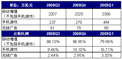 2009年第1季度,空中網手機游戲服務營收為494萬美元,同比增長304%,環(huán)比增長83%;其中手機網游的營收為72萬美元,同比增長379%,環(huán)比增長11%,單機游戲和WAP頁面游戲的服務營收為422萬美元,同比增長293%,環(huán)比增長106%。手機游戲業(yè)務在空中網銷售收入中所占比重由2008年第4季度的10.10%上漲至16.71%。