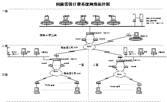 一級為計費中心,位于國脈大廈內,作為整個系統(tǒng)的運行中心和數(shù)據(jù)中心,也是整個系統(tǒng)的樞紐。二級主要位于二個營業(yè)室,是整個系統(tǒng)的分中心。三級為各營業(yè)所和代銷點,分散在全市各處是整個系統(tǒng)的數(shù)據(jù)基礎。