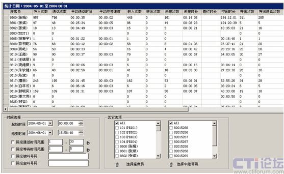 “系統(tǒng)”平臺(tái)可實(shí)現(xiàn)對(duì)整個(gè)電話咨詢(xún)的實(shí)時(shí)監(jiān)控,可以獲得任意一段時(shí)間內(nèi)中繼線的使用情況、座席的使用情況及工作狀態(tài)、進(jìn)出隊(duì)列等,通過(guò)多種圖示、詳細(xì)數(shù)據(jù)報(bào)表,可以找出一天、一周或一個(gè)月內(nèi)呼入總量、瞬間呼入峰值、呼入量分布特點(diǎn)等,從而合理地系統(tǒng)資源和值班人員,在緊急時(shí)間可適當(dāng)?shù)卦鰷p中繼線、座席、IVR端口的數(shù)量,確保系統(tǒng)運(yùn)行最為經(jīng)濟(jì),合理;還可以通過(guò)座席員接打電話情況報(bào)表,對(duì)座席員進(jìn)行科學(xué)的考評(píng)。
