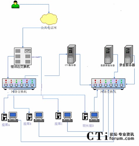 根據以上業(yè)務設計框架,我們確定了客服中心搭建時所需要的設備,系統(tǒng)的拓撲結構示意如下: