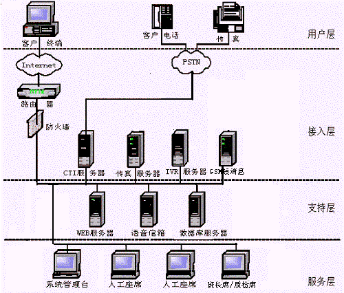 CTI服務(wù)器、IVR/FAX服務(wù)器、人工座席、管理工作站(計費、統(tǒng)計、系統(tǒng)管理、網(wǎng)絡(luò)管理)、數(shù)據(jù)庫服務(wù)器、WWW服務(wù)器、網(wǎng)絡(luò)系統(tǒng)等,其網(wǎng)絡(luò)結(jié)構(gòu)圖如下: