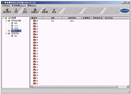 用戶接入:系統(tǒng)啟動(dòng)后,如果用戶電話呼入,則系統(tǒng)自動(dòng)接聽(tīng),并提請(qǐng)用戶輸入密碼校驗(yàn)后進(jìn)入會(huì)議系統(tǒng)。也可'集體撥號(hào)'、'單個(gè)撥號(hào)''點(diǎn)名'