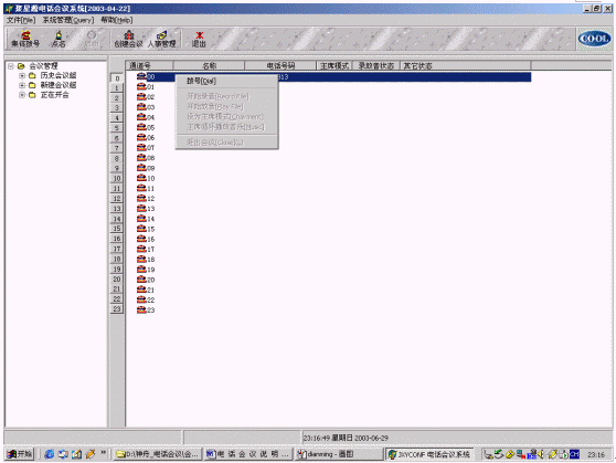 3、系統(tǒng)上方是工具欄,包括:創(chuàng)建會(huì)議、人事管理、啟動(dòng)、集體撥號(hào)、雙工/單工、點(diǎn)名、電話薄等快捷鍵。