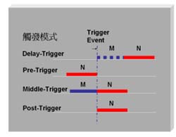 、中間觸發(fā)(middle-trigger)及后觸發(fā)(post-trigger)。其觸發(fā)點與所采集到數(shù)據(jù)的關(guān)系如下圖所示: