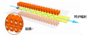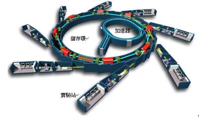 同步輻射(synchrotron radiation)是由以近光速行進(jìn)的電子束在受外在偏轉(zhuǎn)磁鐵的磁力改變運(yùn)動(dòng)方向時(shí)所發(fā)射的電磁波。同步加速器的結(jié)構(gòu)包含電子槍或離子源、線型加速器、偏轉(zhuǎn)磁鐵、真空腔、RF腔、實(shí)驗(yàn)站等。電子或離子首先由電子槍或離子源激發(fā)產(chǎn)生,經(jīng)直線加速器加速到接近光速,再通過(guò)輸送管道進(jìn)入儲(chǔ)存環(huán)。儲(chǔ)存環(huán)是由許多磁鐵組成。粒子在儲(chǔ)存環(huán)旋轉(zhuǎn)處受到偏轉(zhuǎn)磁鐵作用發(fā)生偏轉(zhuǎn),并在直線段持續(xù)加速以保持動(dòng)能,并在儲(chǔ)存環(huán)中作回旋運(yùn)動(dòng),同時(shí)不斷發(fā)出同步光。光束路線將同步光從儲(chǔ)存環(huán)引導(dǎo)出來(lái),憑借內(nèi)部精密的光學(xué)組件將同步光聚焦并選取合適波段的同步輻射送入實(shí)驗(yàn)站?茖W(xué)研究人員在實(shí)驗(yàn)站測(cè)量同步輻射經(jīng)過(guò)物體反射、衍射、散射及透射后的光譜或是探測(cè)物體被光子激發(fā)出的電子、離子等,來(lái)研究物體的結(jié)構(gòu)性能,探索微觀世界的奧秘。