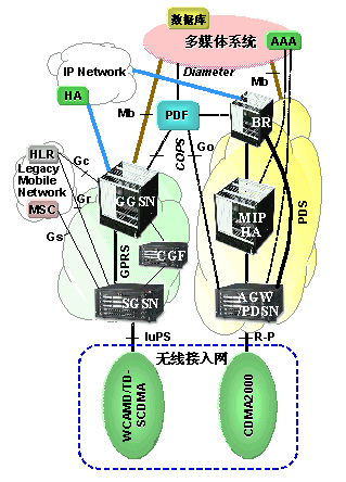 PDS采用MIP技術(shù),是支持多媒體的和傳統(tǒng)的移動數(shù)據(jù)業(yè)務(wù)的網(wǎng)絡(luò)。AGW包括PDSN以及其他一些所需要的功能,提供了對各種接入網(wǎng)絡(luò)的公共接口。它提供移動IP登記和鑒權(quán),支持外部代理(FA)和分組數(shù)據(jù)傳輸,切換、AAA客戶端、QoS管理和策略執(zhí)行等功能。歸屬代理(HA)主要完成用戶當前附著點的登記和用戶IP包的前轉(zhuǎn)兩大功能。
