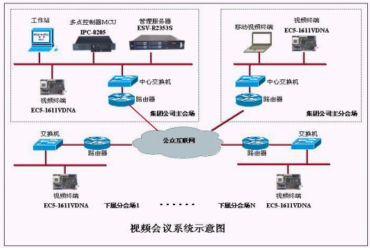 整個(gè)視頻會(huì)議系統(tǒng)采用EC5-1611VDNA作為會(huì)議室型視頻終端及FSC-1713VNA作為多點(diǎn)會(huì)議服務(wù)器?梢栽O(shè)立一個(gè)或者多個(gè)中心,通過數(shù)字傳輸信道,星形級(jí)聯(lián)而成。