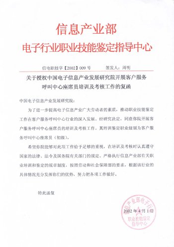 中國(guó)電子信息產(chǎn)業(yè)發(fā)展研究院職業(yè)技能培訓(xùn)部是中國(guó)電子信息產(chǎn)業(yè)發(fā)展研究院旗下專業(yè)從事IT職業(yè)技能培訓(xùn)的機(jī)構(gòu)。呼叫中心職業(yè)技能培訓(xùn)工作是培訓(xùn)中心常年開展的主要培訓(xùn)項(xiàng)目。培訓(xùn)中心受信息產(chǎn)業(yè)部委托,負(fù)責(zé)全國(guó)范圍內(nèi)"呼叫中心客戶服務(wù)座席員"的授權(quán)培訓(xùn)及考核工作。既是呼叫中心行業(yè)基礎(chǔ)操作人員培訓(xùn)及考核的權(quán)威機(jī)構(gòu),又是配合行業(yè)管理、全面支撐和提升整個(gè)呼叫中心產(chǎn)業(yè)的服務(wù)機(jī)構(gòu)。