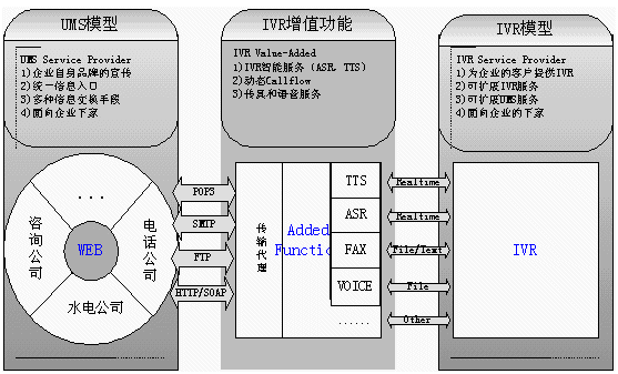 。ǘ㊣VR系統(tǒng)的傳統(tǒng)缺點(diǎn)是缺乏智能化,流程更改困難,播放的語音或者內(nèi)容必須預(yù)先錄制.所以我們提供UMS服務(wù),增強(qiáng)IVR的功能. 使我們的IVR功能增強(qiáng)(Ext-IVR Service Provider)