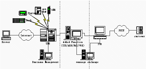 傳統(tǒng)UMS的分散的網(wǎng)民,而IVR, UMS服務(wù)提供商的客戶是企業(yè),系統(tǒng)的使用者則是企業(yè)的客戶(即系統(tǒng)面向下家,由下家為最終客戶提供服務(wù)),分離的模式可以有兩個獨(dú)立的企業(yè)來運(yùn)營系統(tǒng),IVR Service由具有電信資源的企業(yè)(如:具有接入號,有電信中繼資源,還有CTI系統(tǒng)建設(shè)經(jīng)驗(yàn))運(yùn)營。UMS Service由ISP企業(yè),網(wǎng)站門戶企業(yè)等在互聯(lián)網(wǎng)絡(luò)有建設(shè)經(jīng)驗(yàn)的企業(yè)運(yùn)營。兩家企業(yè)密切合作。共同提供完善的統(tǒng)一的信息服務(wù)。