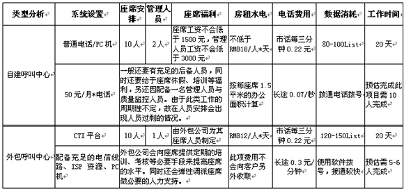 以上是以Telemarkering項(xiàng)目舉例,如需完成一萬條數(shù)據(jù)的外呼工作,自建呼叫中心與外包型呼叫中心的區(qū)別。以上數(shù)字只是提現(xiàn)在設(shè)備、人員效率等方面問題,另定期的人員培訓(xùn)及相關(guān)系統(tǒng)的維護(hù)將是費(fèi)用產(chǎn)生的一大因素。其實(shí)在項(xiàng)目的實(shí)施過程中發(fā)生的費(fèi)用只是一部分,從公司的運(yùn)營角度看是可以節(jié)省很大的精力(例如:人員招聘、培訓(xùn)、福利待遇)及運(yùn)營時(shí)間。