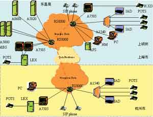 杭州秋濤局配置的是A7505中繼網(wǎng)關(guān)、A1540接入網(wǎng)關(guān)以及其他的綜合接入設(shè)備、SIP終端、H.323終端等。A7505同當(dāng)?shù)亟粨Q機(jī)配合可以經(jīng)由IP骨干網(wǎng)實現(xiàn)上海到杭州的長途語音業(yè)務(wù)。A1540及經(jīng)由它的ST700可以實現(xiàn)NGN的語音數(shù)據(jù)業(yè)務(wù)。杭州到上海的連接是通過中國電信的IP骨干網(wǎng)實現(xiàn)的。