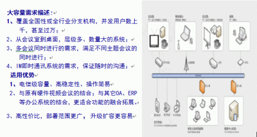 太平洋保險(xiǎn)集團(tuán)下根據(jù)業(yè)務(wù)模式劃分為產(chǎn)險(xiǎn)、壽險(xiǎn)2個(gè)公司,每個(gè)公司在全國(guó)各省都有分公司,目前集團(tuán)公司管理著主服務(wù)器,每個(gè)分公司都有自己的從服務(wù)器,總計(jì)60余臺(tái)從服務(wù)器,應(yīng)用的交互點(diǎn)數(shù)1000點(diǎn),旁聽點(diǎn)數(shù)300點(diǎn)。保險(xiǎn)行業(yè)銷售人員流動(dòng)快、各種培訓(xùn)頻繁、新險(xiǎn)種推出層出不窮,其中省分公司、眾多支公司與銷售網(wǎng)點(diǎn)人員的即時(shí)音視頻交流是重中之重,為了滿足客戶要求系統(tǒng)平臺(tái)支持大容量會(huì)議人數(shù)、多會(huì)議同時(shí)召開以及流暢的音視頻交換的要求,國(guó)際視訊知名廠商北京威速科技有限公司專門為大企業(yè)級(jí)用戶開發(fā)出了高性能大容量的視頻會(huì)議產(chǎn)品。這種更適用組織機(jī)構(gòu)龐大、更穩(wěn)定的純軟件網(wǎng)絡(luò)視頻會(huì)議平臺(tái),是迄今為止業(yè)內(nèi)唯一勝任單會(huì)議室同時(shí)容納千人以上用戶開會(huì),并支持無限量會(huì)議室,并且通過級(jí)聯(lián)技術(shù)可以同時(shí)支持幾千路音視頻交互并發(fā),同時(shí)實(shí)現(xiàn)一個(gè)集視頻交互、音頻交互、屏幕廣播、遠(yuǎn)程控制、文字交流、電子白板、文檔共享、文件傳輸?shù)榷囗?xiàng)功能于一體的綜合多媒體遠(yuǎn)程會(huì)議平臺(tái)。自V2 conference應(yīng)用以來,承擔(dān)了公司絕大部分遠(yuǎn)程交流任務(wù),太平洋保險(xiǎn)集團(tuán)已把視頻會(huì)議交流當(dāng)作工作的一部分,成為工作之必須的習(xí)慣。極大地提高了企業(yè)運(yùn)作效率、降低了成本,而這些正是金融保險(xiǎn)機(jī)構(gòu)的制勝之道。