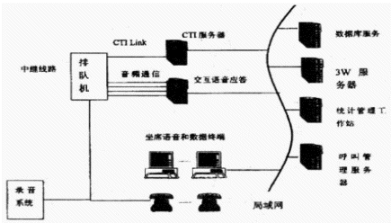 中型呼叫中心:人工座席在50~100之間的呼叫中心稱(chēng)為中型呼叫中心。中型呼叫中心PBX與CTI服務(wù)器、人工座席直接相連,人工座席又與應(yīng)用服務(wù)器相連,客戶(hù)資料存儲(chǔ)在應(yīng)用服務(wù)器中,應(yīng)用服務(wù)器實(shí)時(shí)地將打入電話的客戶(hù)的資料自動(dòng)地在計(jì)算機(jī)屏幕上彈出,使座席人員能及時(shí)獲得相應(yīng)信息。CTI服務(wù)器一般由CTI硬件開(kāi)發(fā)商的板卡和PC組成。