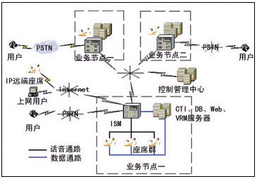 每個業(yè)務節(jié)點都由ISM(智能交換模塊)、CTI服務器、DB(數據庫)、VRM(語音資源模塊)和座席等模塊構成,下面逐一介紹各模塊的作用和功能。