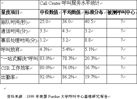 以下是Purdue大學1999年Benchmarking研究報告的部份內(nèi)容,顯示了美國分別在15個不同行業(yè)的Call Center的基準測試數(shù)據(jù)。