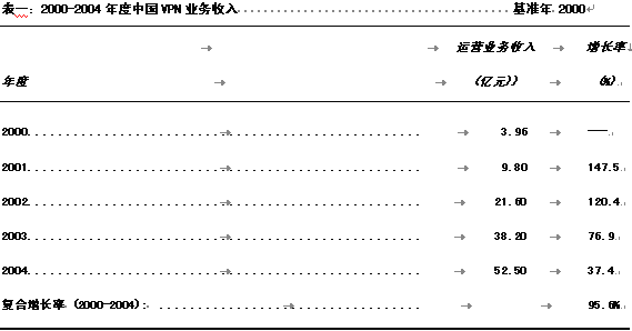 2000年,中國VPN運(yùn)營業(yè)務(wù)收入為人民幣3.96億元,主要業(yè)務(wù)提供商為新興的電信運(yùn)營商如網(wǎng)通、吉通、聯(lián)通等公司,以及數(shù)量可觀的或明或暗的網(wǎng)絡(luò)公司,VPN用戶主要集中在規(guī)模較大的外企、金融領(lǐng)域以及與IT相關(guān)的企業(yè)之中。隨著更多的虛擬運(yùn)營商進(jìn)入VPN服務(wù)市場(chǎng),以及企業(yè)成本意識(shí)的不斷增強(qiáng),VPN用戶群體已經(jīng)呈擴(kuò)散之勢(shì),制造業(yè)、FMCG連鎖經(jīng)營業(yè)、酒店業(yè)等已經(jīng)迅速進(jìn)入這一市場(chǎng)。預(yù)計(jì)到2004年度,國內(nèi)VPN業(yè)務(wù)收入可以達(dá)到52.5億元人民幣,年復(fù)合增長率為95.6%。各年度測(cè)算數(shù)據(jù)見表一。